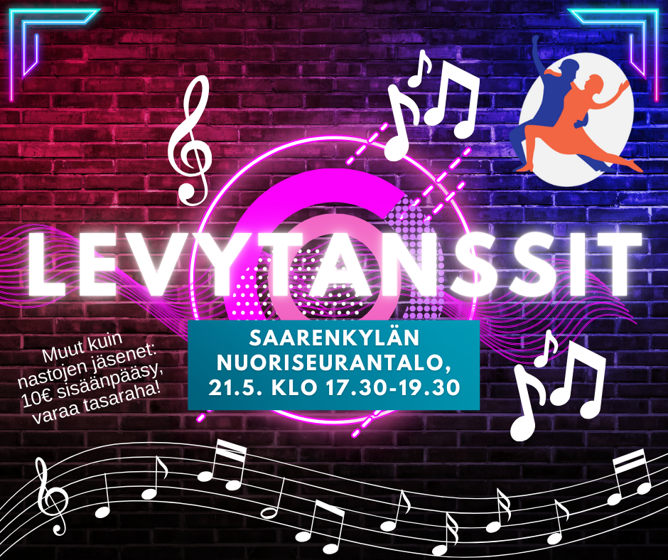 Tänään levytanssit Saarenkylän nuorisoseurantalolla. Jäsenille ilmaiset levytanssit ja vierailijoille 10€ hintaan.