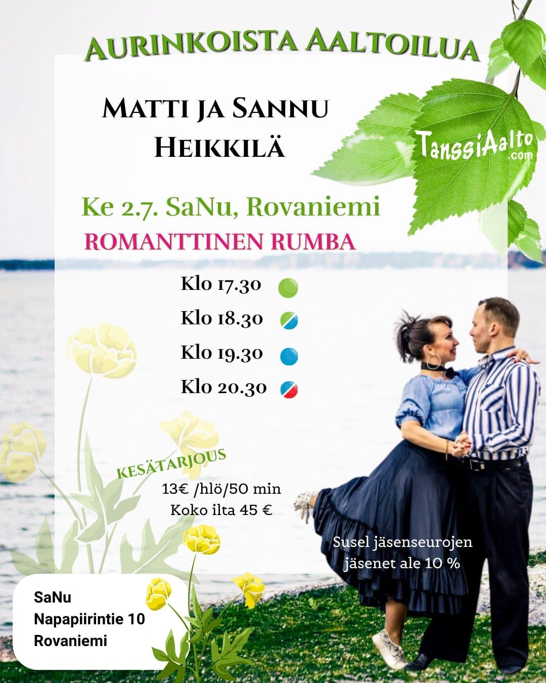 Napapiirin seuratanssijat on aktivoinut virkistysiltapäivien tarjoamisen yrityksille. Kokonaisuus pitää sisällään kaksi tanssilajia ja kahvittelun. Tällä viikolla Nastojen vieraana oli Traficomin neljäkymmentä työntekijää. Opettajina tilaisuudessa toimivat Kaarina ja Pekka Kulju.