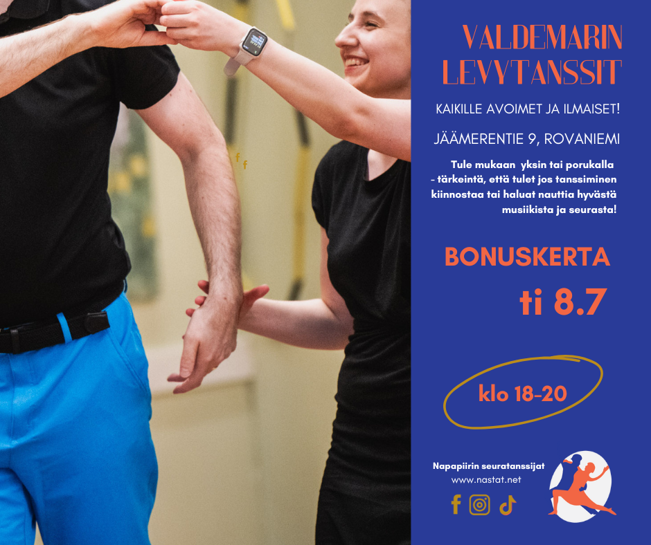 Valdemarilla levytanssit 8.7 Ylimääräiset levytanssit Valdemarilla tiistaina 8.7 klo 18-20 Julkaistu: 07.07.2025
